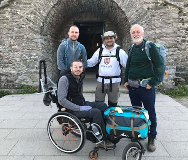 De repente, apareceu um grupo de irlandeses que nos ofereceu ajuda e nós aceitamos sem hesitar. Eles ajudaram a erguer minha cadeira e passamos por mais de 100 metros de uma trilha complicadíssima comigo sobre a cadeira suspensa